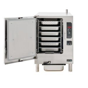 The Southbend EZ24-5 EZ Steam convection steamer is boilerless, requiring no plumbing connection for simple installation. This means users must manually fill and empty the reservoir. A light indicates when the water level is low, informing users when to refill it. As many as five sheet pans can be held in the Southbend EZ24-5 convection…