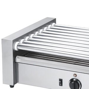 The MoTak HDRG1 hot dog roller grill is a countertop unit made of durable stainless steel for rust and corrosion resistance. It measures 22 1⁄2 inches wide by 8 1⁄2 inches deep by 8 inches high and is equipped with five stainless steel rollers. The grill’s roller-type design is made to evenly heat 12 hot…