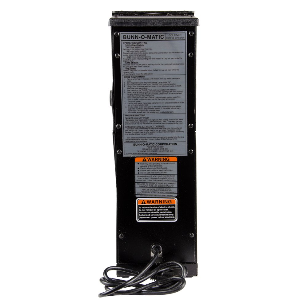 The BUNN 22104.0000 bulk grinder has a hopper that holds 1 pound of coffee beans. A heavy-duty burr grinds beans, and several grind settings are available that can grind 1 pound of beans in 30 seconds or less. With the turbo action, the coffee is drawn through the grind chamber. The motor stops when the coffee bag is removed and will not begin grinding before a bag is in place. The BUNN 22104.0000 coffee grinder has a lever to clean the grind chamber, preventing clumps. It has a black finish.