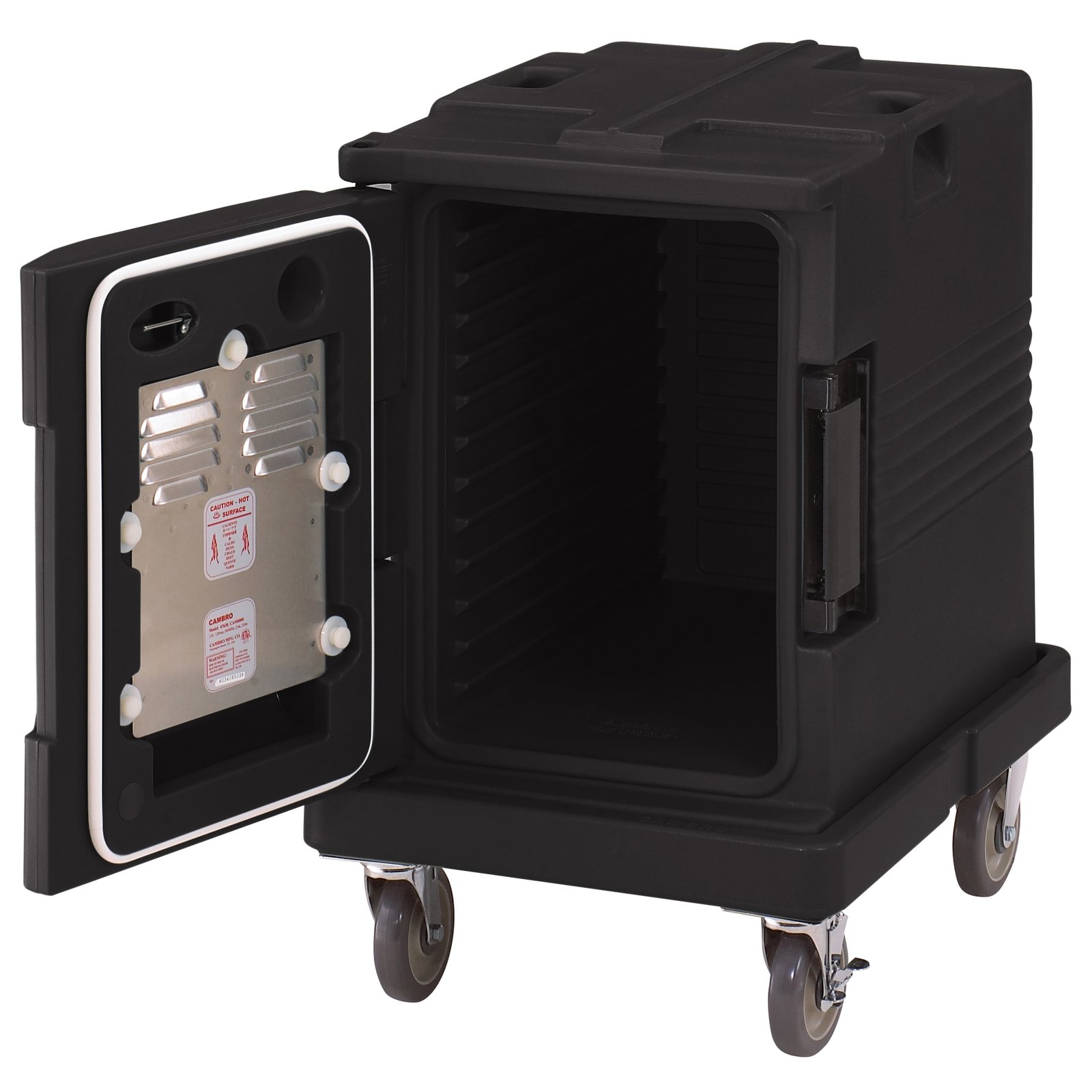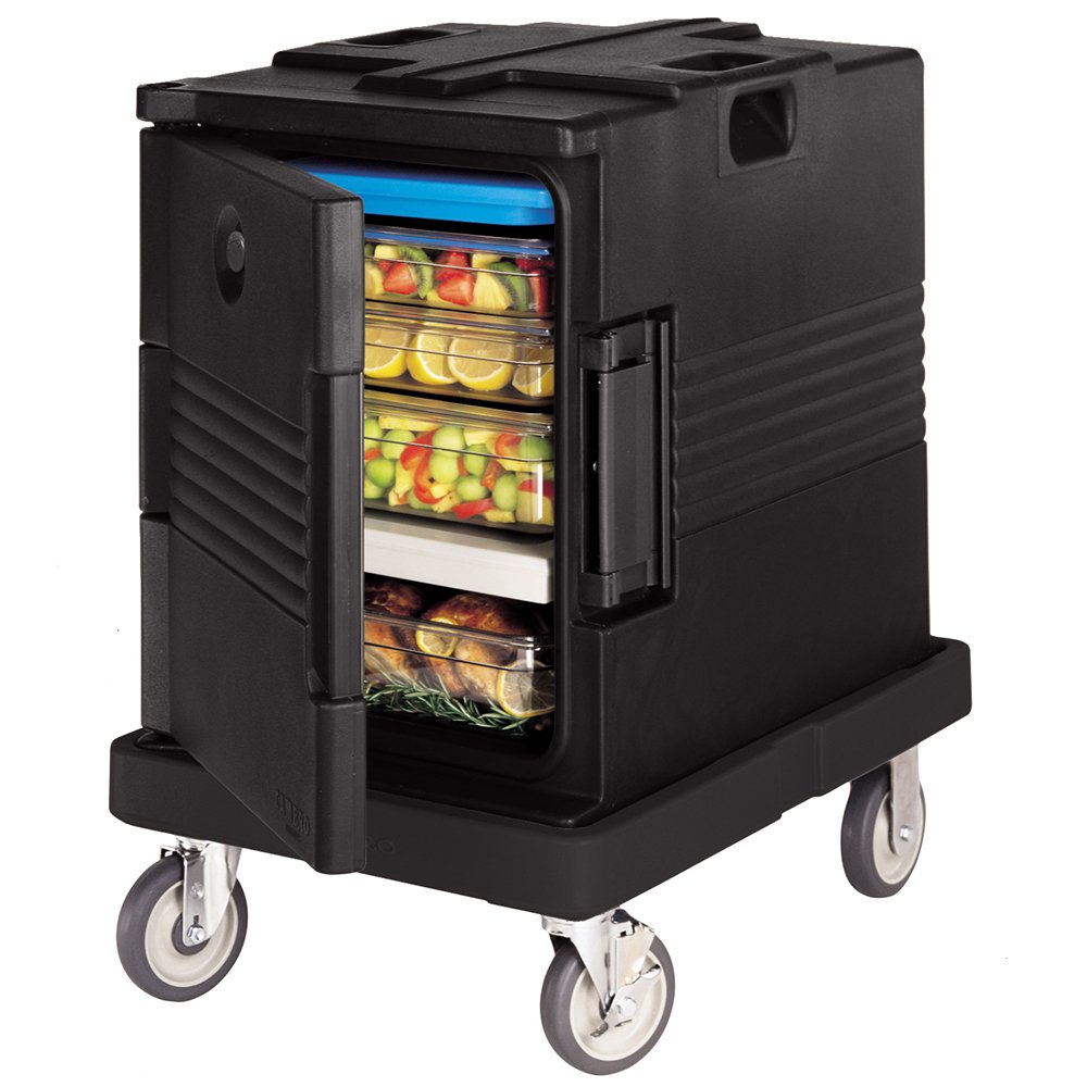 The Cambro CD400110 Camdolly® food pan carrier dolly is compatible with the UPCS400 and UPC400 food pan carriers, making it easy to store and transport loads as much as 300 pounds. It comes in black, which blends into different settings. Since it is made of heavy-duty plastic, this Cambro CD400110 Camdolly food pan carrier dolly is resistant to corrosion, cracks, dents, and other minor damage. There are two 5-inch fixed casters and two 5-inch swivel casters for maneuvering over a variety of surfaces.
