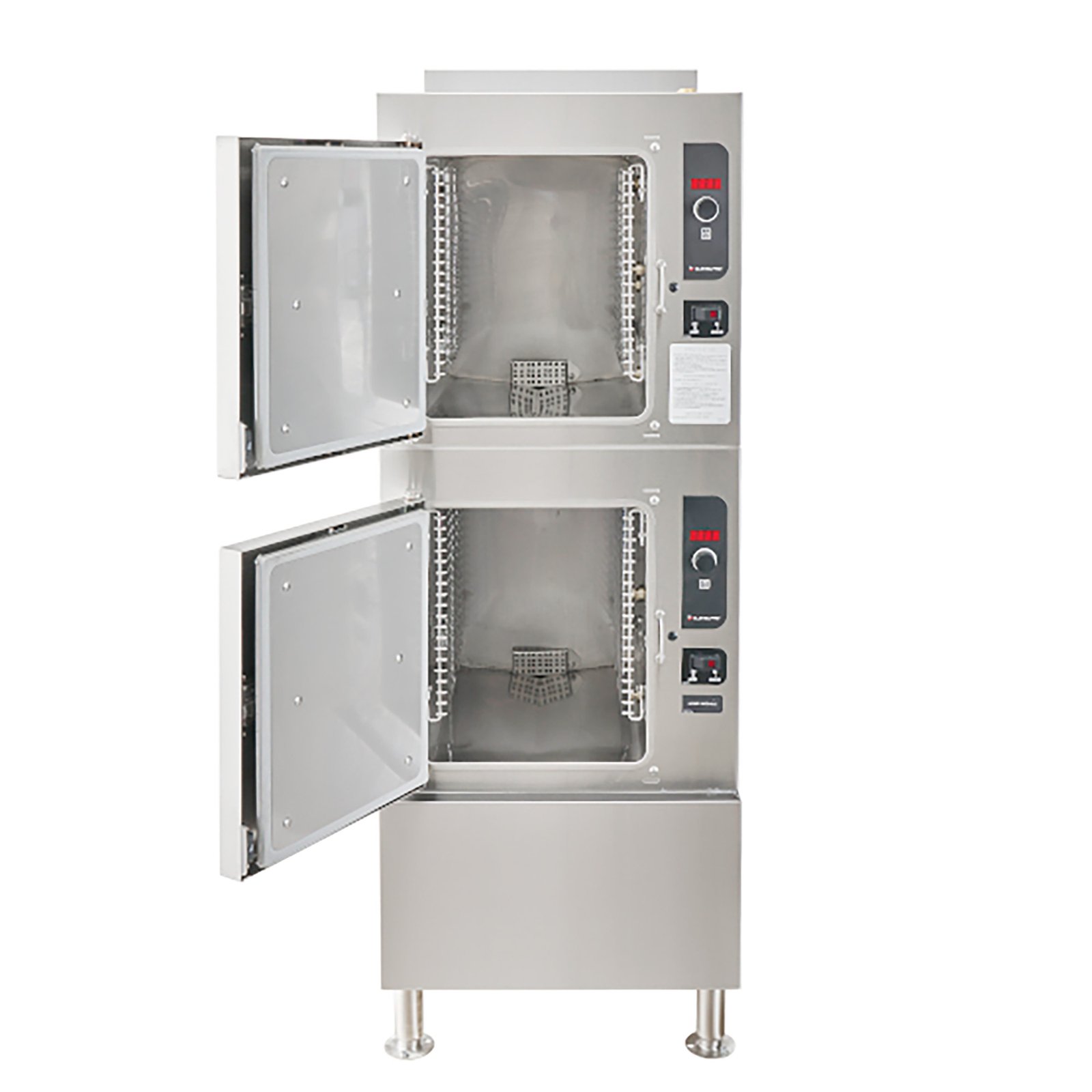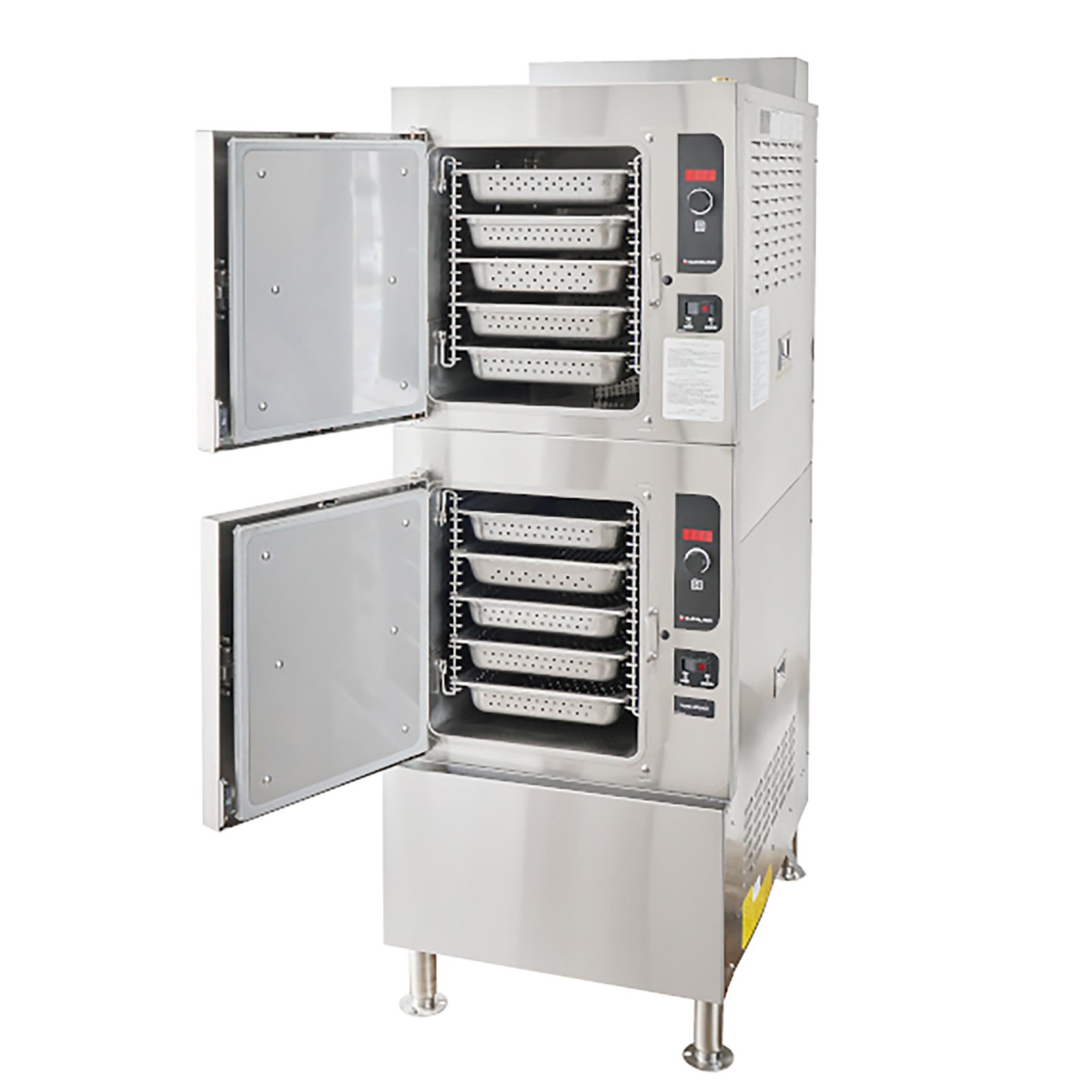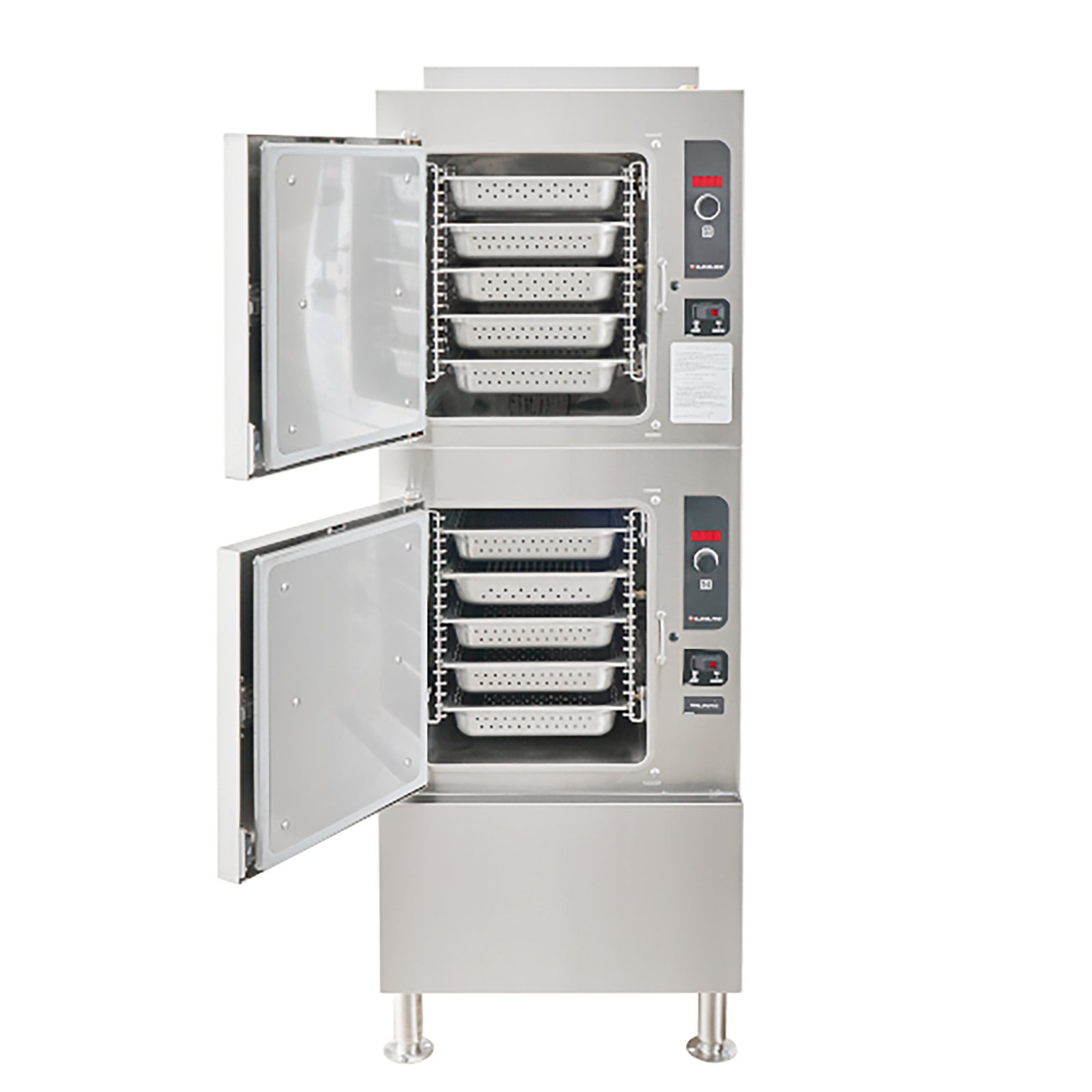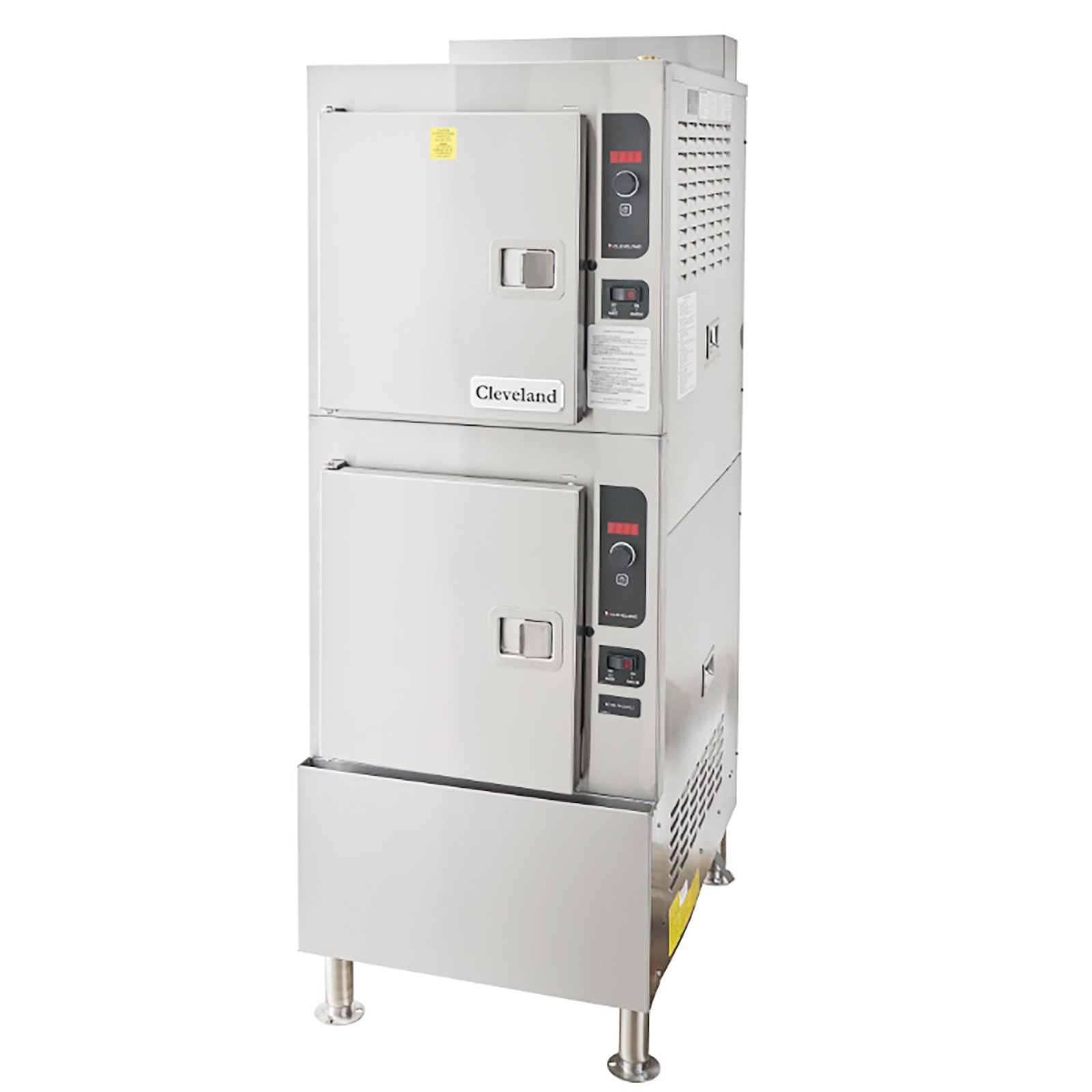 The Cleveland 24CGA10.2 SteamCraft® Gemini™ floor-model steamer is perfect for large establishments that need to steam large portions of product. This unit has two compartments that hold five full-size pans each, and each compartment has its own controls, valves, and generator. Constructed of stainless steel, the two generators, doors, and cooking cavities are heavy duty and resistant to corrosion. Heat is evenly distributed throughout the unit with brass steam jets.