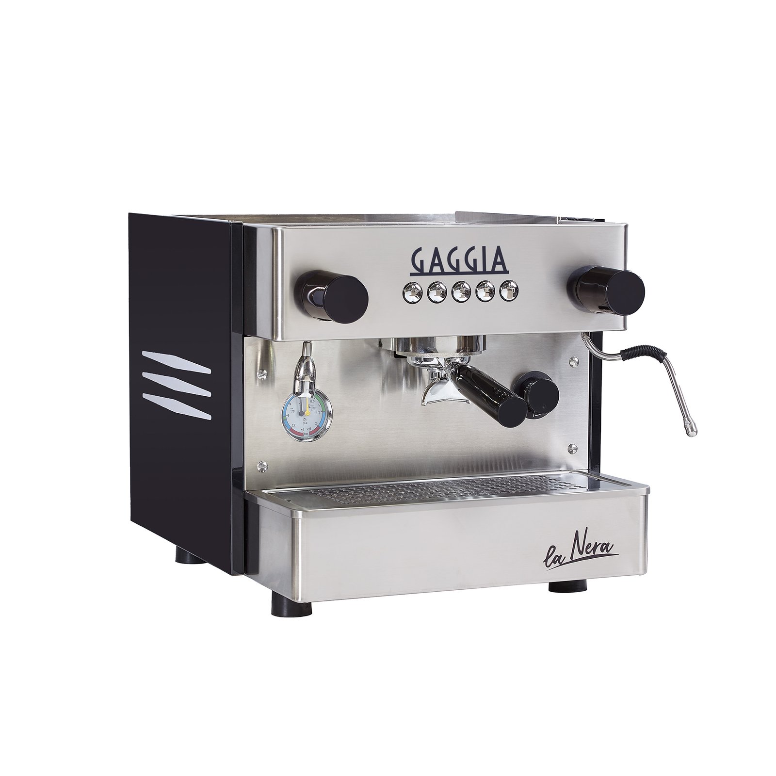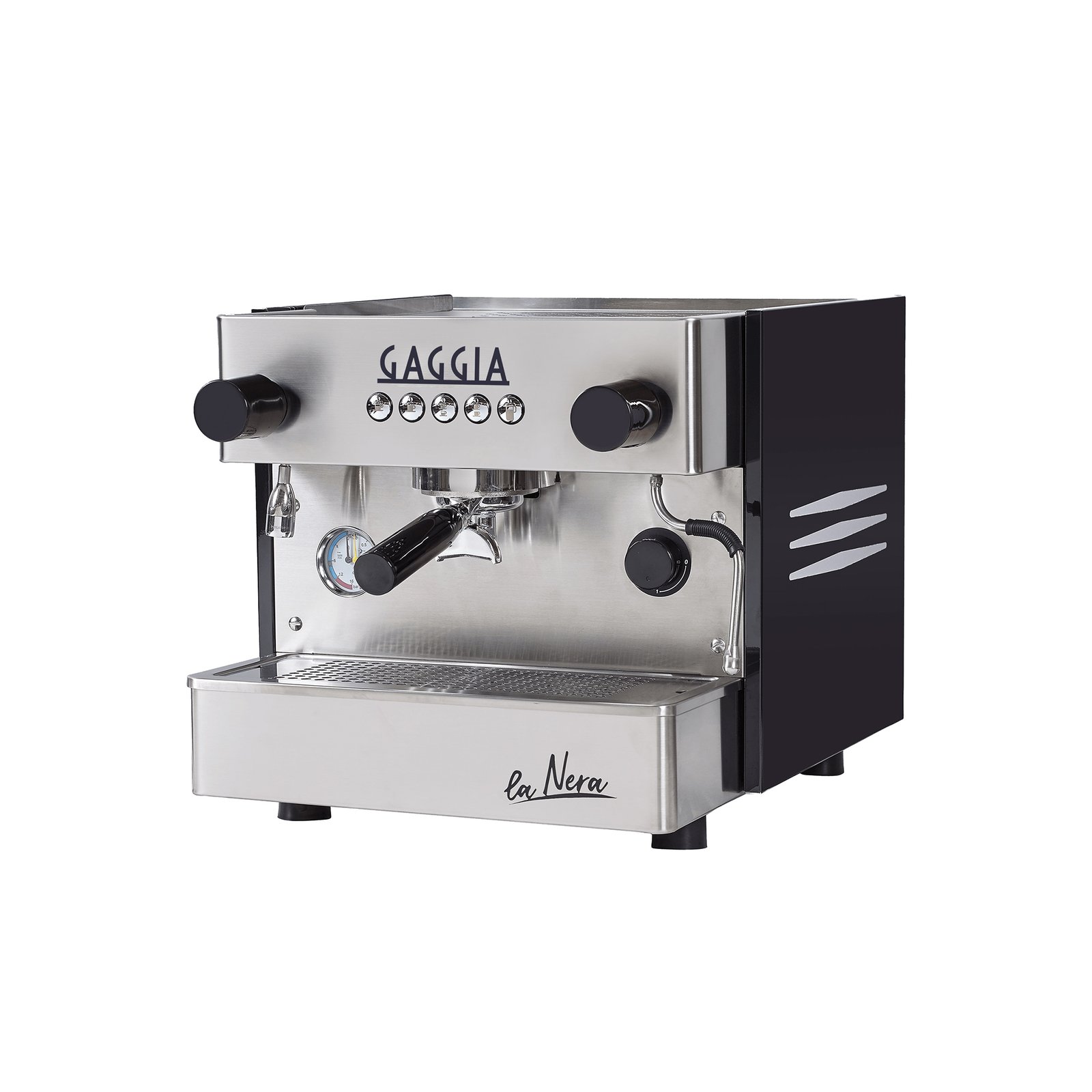 Built for efficiency, the Gaggia La Nera 1G espresso machine includes a 5-liter steam boiler and electronic control for water level management, maintaining steady operation throughout the day. Its one-group design supports cups as tall as 3 3⁄5 inches, accommodating various serving sizes. With five direct selection pushbuttons per group—four programmable and one manual dosage—baristas can customize the brewing process to meet customer preferences. Featuring a black side panel and a silver front finish, this unit blends functionality with modern aesthetics.