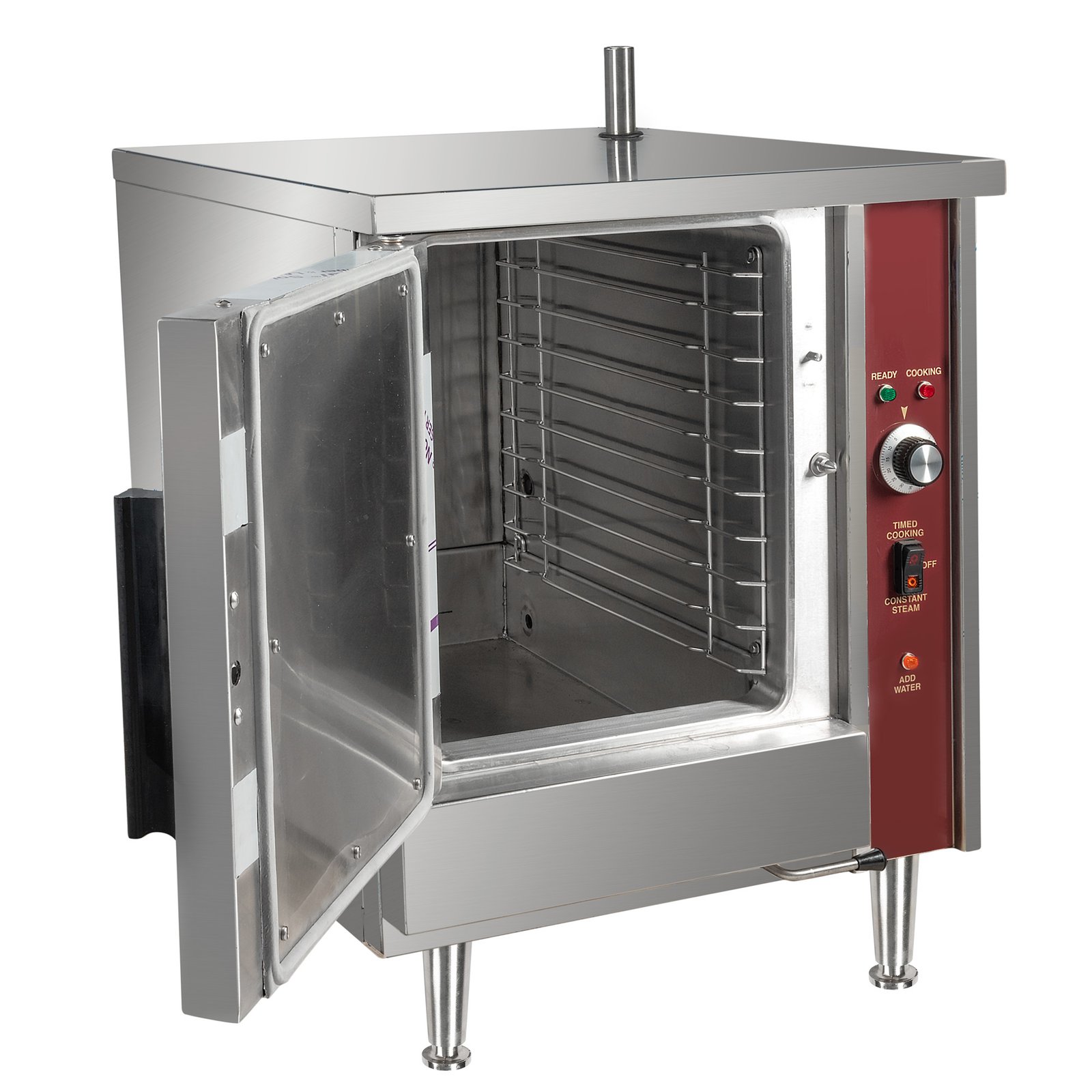 As many as five sheet pans can be held in the Southbend EZ24-5 convection oven simultaneously. Users can set the cook cycle time with the electromechanical knob, which has a limit of 60 minutes. The interior and exterior of the steamer are made of durable stainless steel that resists corrosion and denting. This unit is elevated above countertops by 4-inch-tall legs, which can be adjusted.